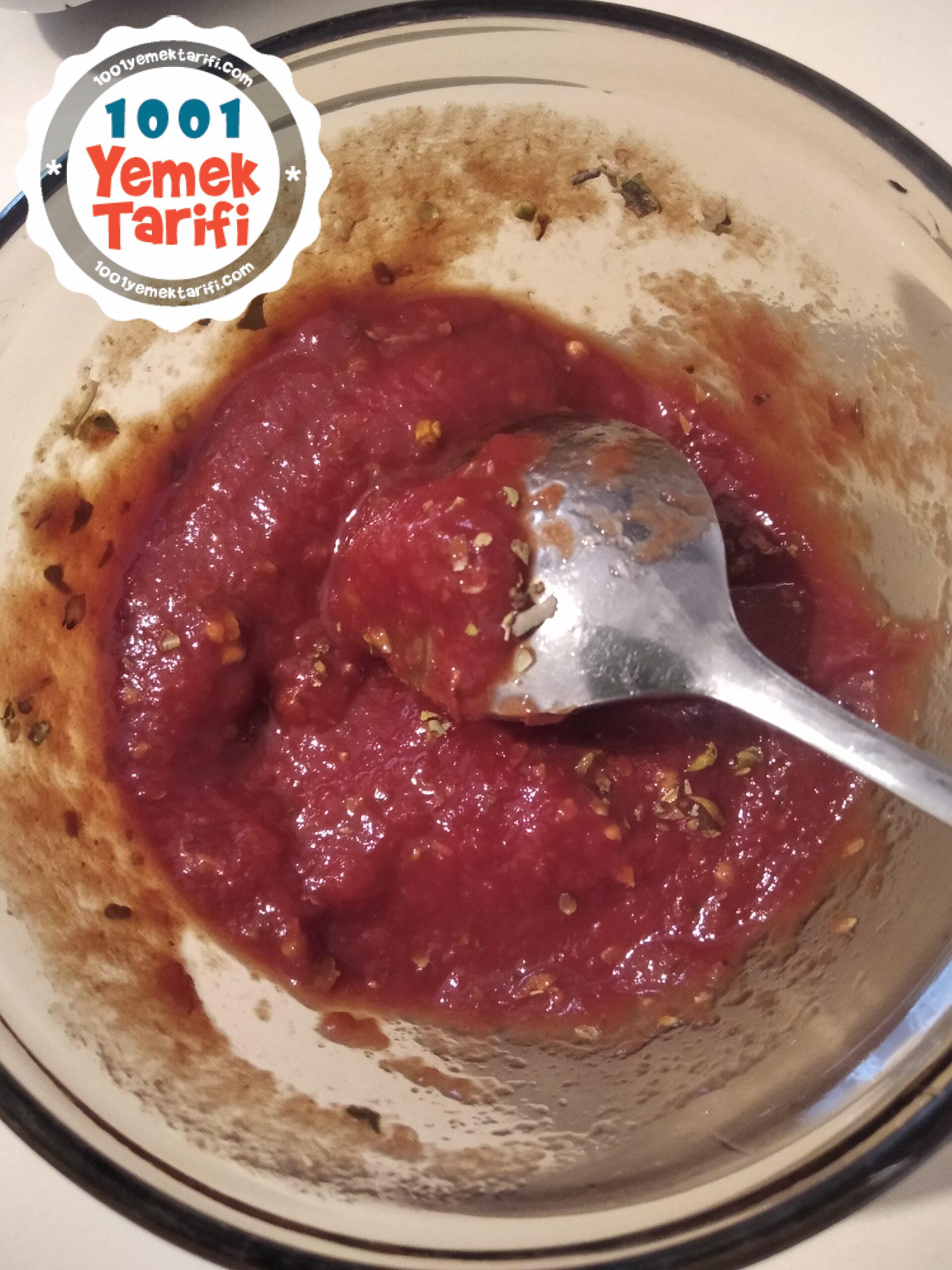 - Fırından çıkan patlıcanların üzerine pizza sosu fırça yardımıyla sürülür