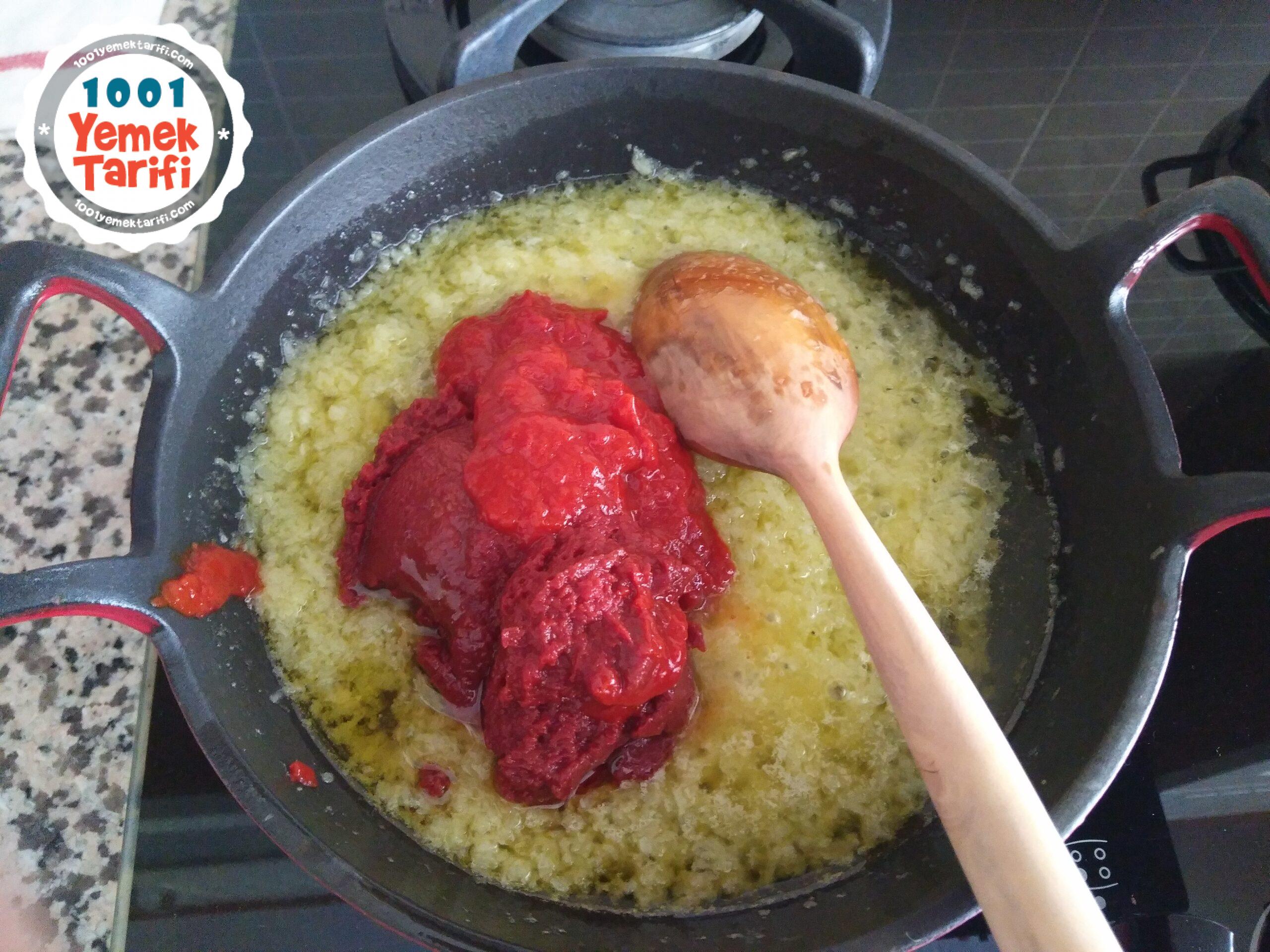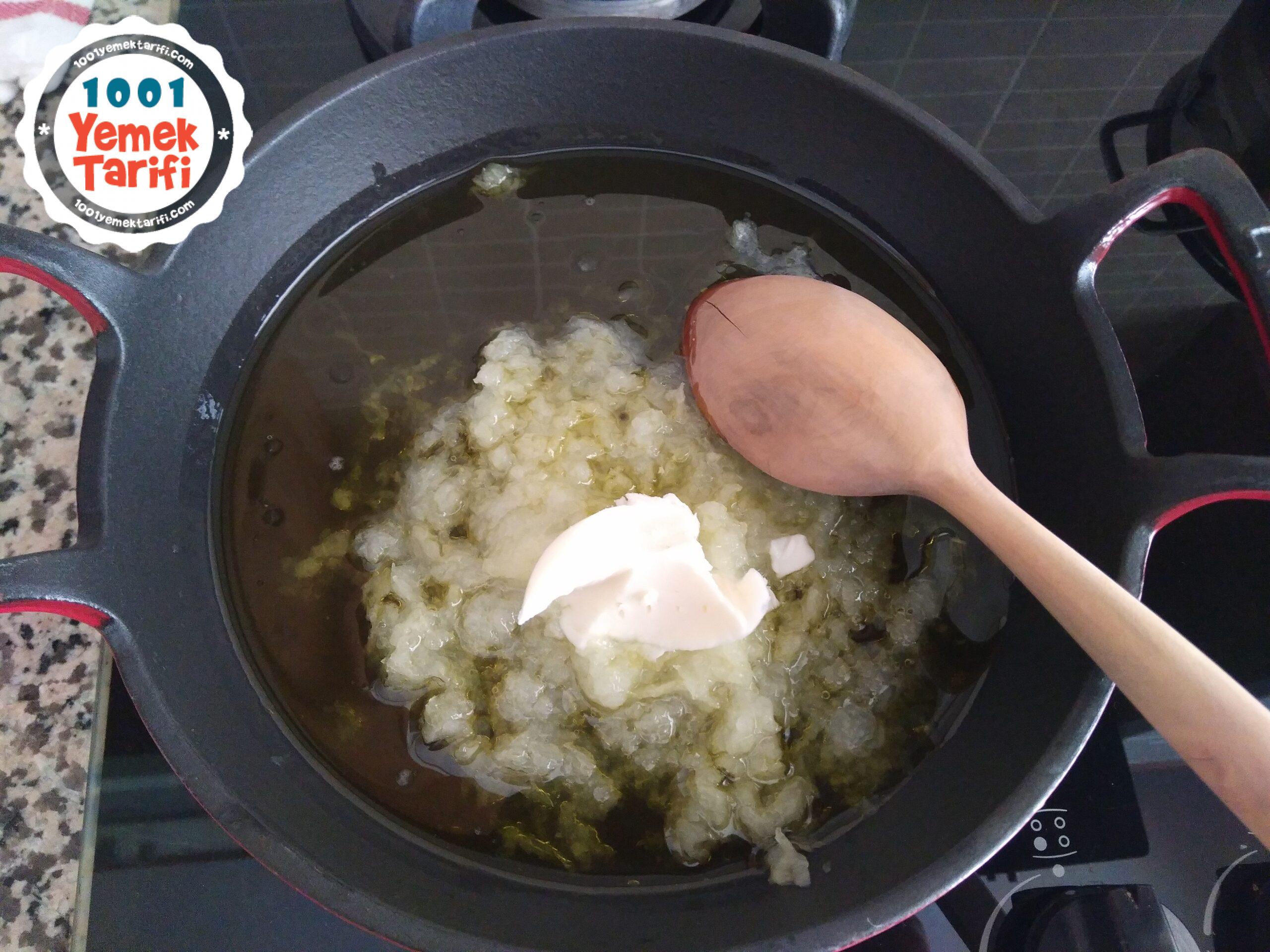 - 3. Zeytin yağını ve tereyağını ayrı bir tavaya alıp önce rendelediğim soğan ile kavurdum sonra salçaları da ekleyerek beraber kavurdum.