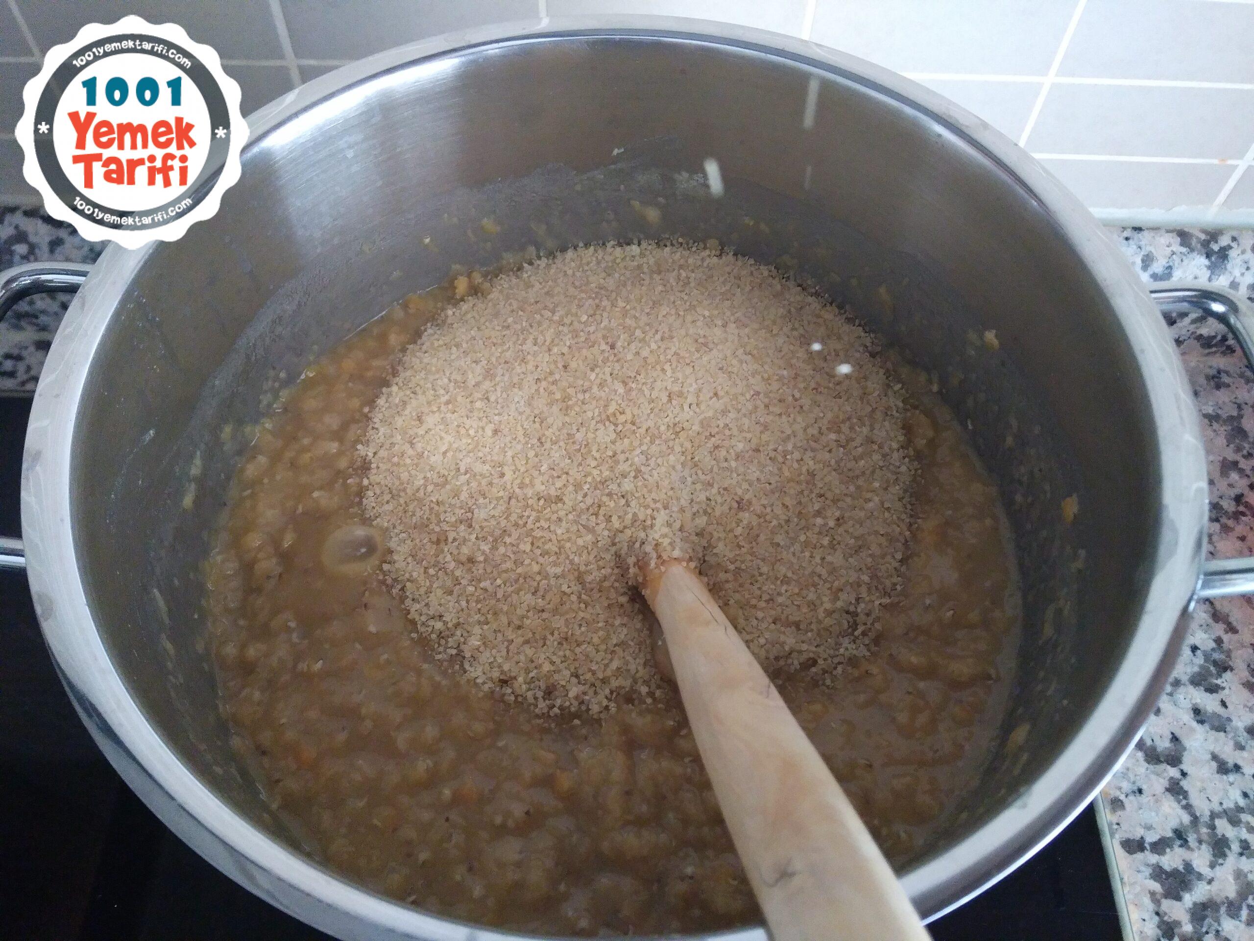 - 2. Suyunu çeken mercimeklerin üzerine bulguru ekledim. İyice karıştırdım ve homojen bir karışım elde ettim.Tuzu bu aşamada koydum. tencerenin kapağını kapatıp bulgurun şişmesi ve karışımın soğuması için yaklaşık yarım saat bekledim.