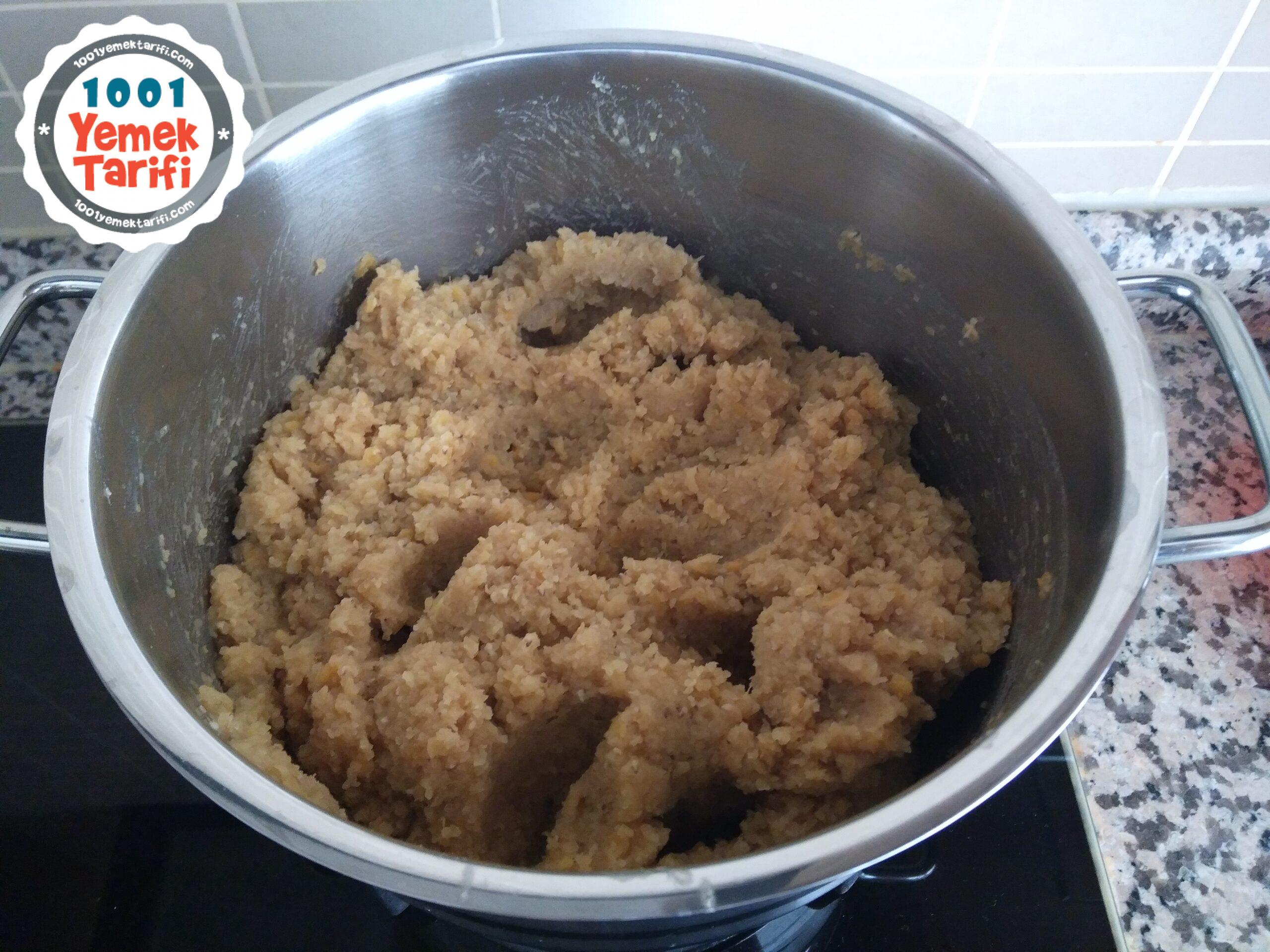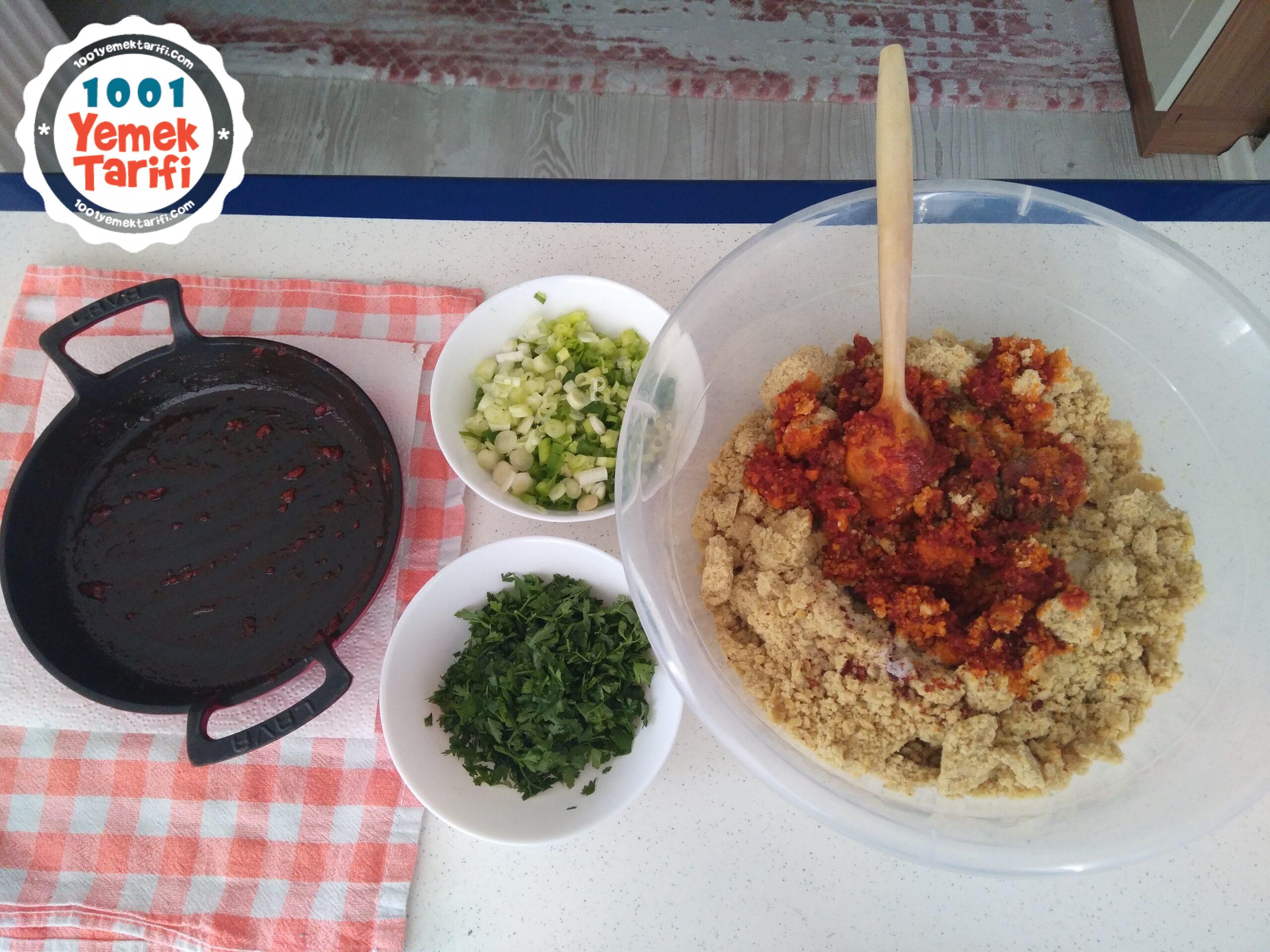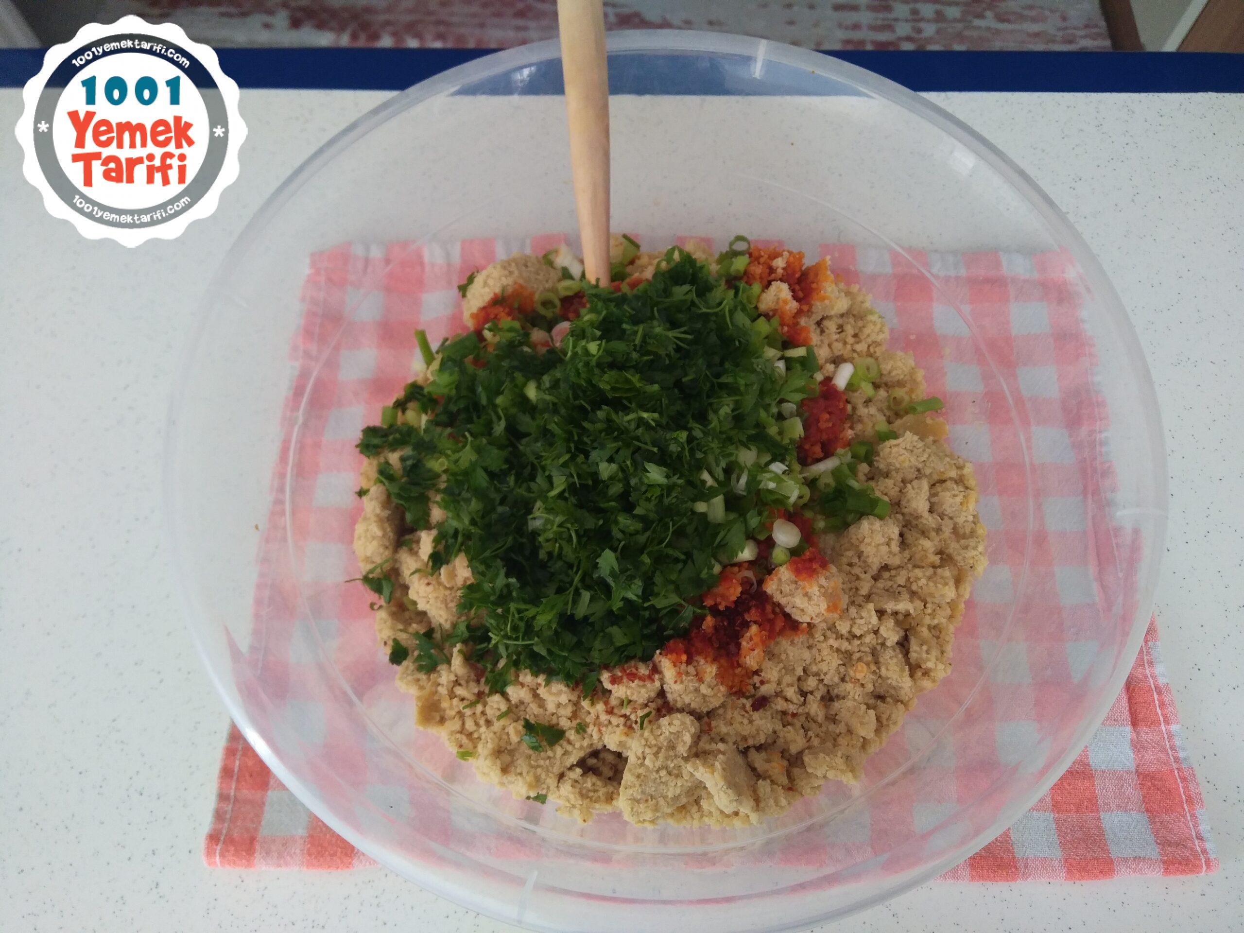 - 4. Yarım saat tencerede dinlenen mercimek ve bulguru , kavurduğum soğan ve salçayı büyük bir kabın içinde birleştirdim.Üzerine küçük küçük doğradığım yeşil soğan ve maydanozu ekleyip iyice yoğurdum.Tüm baharatları, nar ekşisini, limon suyunu ekleyip tekrar yoğurdum ve şekil vererek servis tabağına aldım.