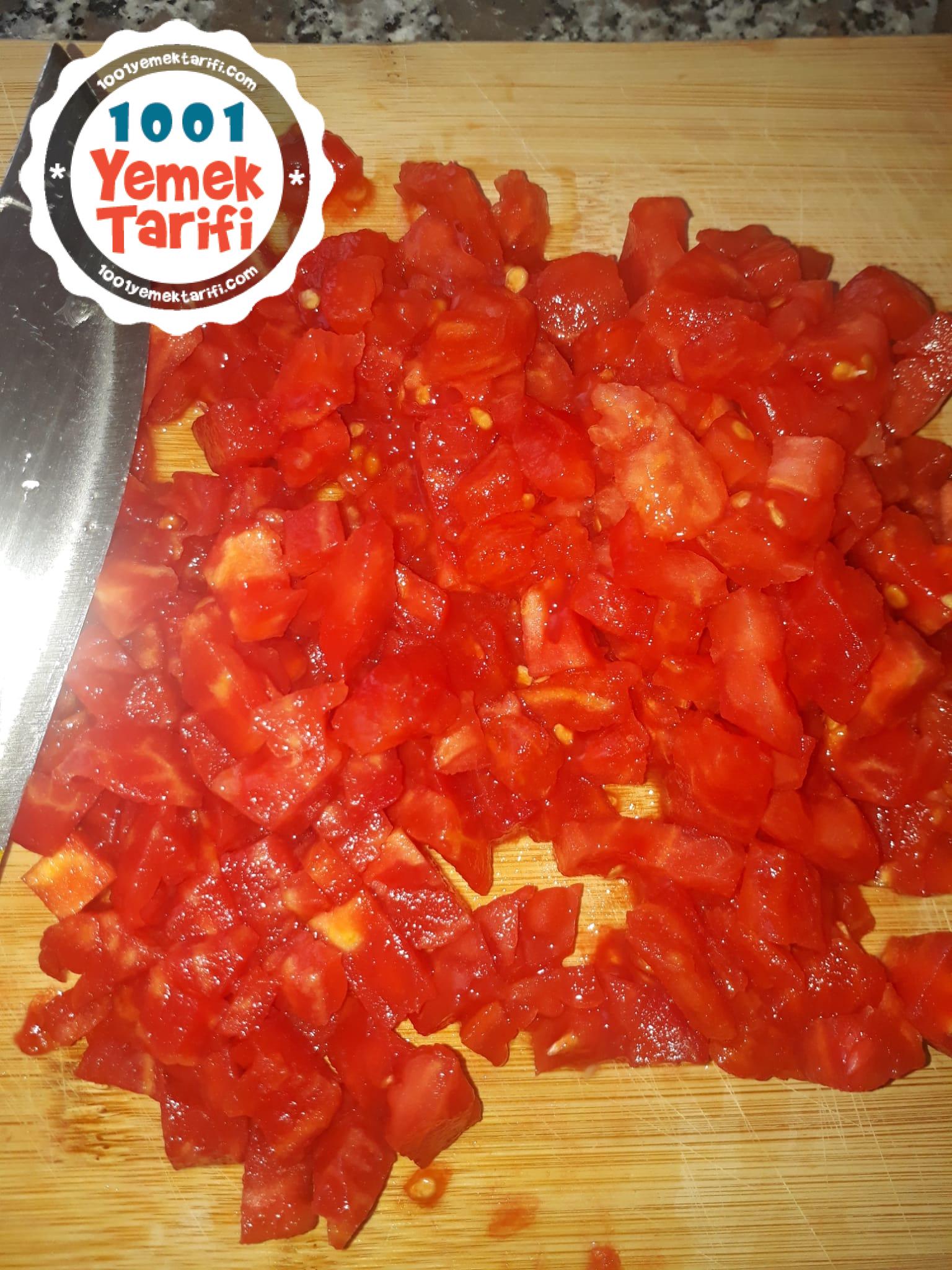 - 2 adet domatesleri çok küçük olmamak şartı ile doğrayıp tenceremize aktaralım sonra üzerine yarım tatlı kaşığı salça kuru nane ekleyip sarımsağı da küçük küçük doğrayıp ekleyelim