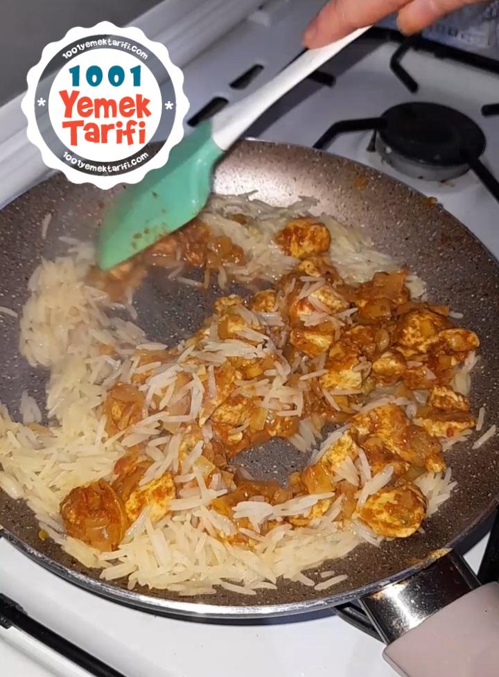 - Aynı tavada yıkamadan pirinçleri ekliyoruz. Biraz döndürünce sıcak suyu ilave ediyoruz.