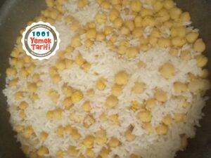 - Üzerine 3 su bardağı tavuk suyu, nohut ve tuzu da ekleyip tencerenin ağzını kapatalım.