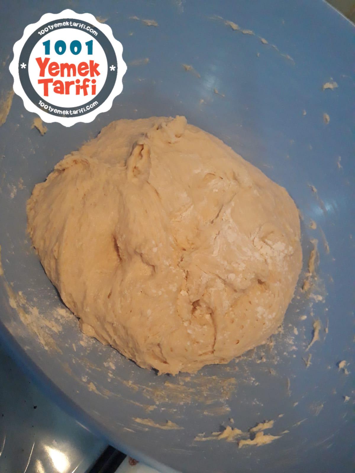 - Öncelikle hamur için genişce bir kaba un hariç bütün malzemeleri alın ve elinize çok az yapışan yumuşak bir hamur elde edin.