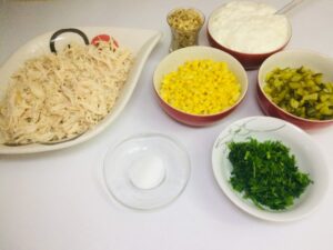 - Kornişonlar ve dereotu incecik doğranıyor, karıştırma kabına tavuk, kornişon, dereotu, ve mısırı ekleyip karıştıralım.