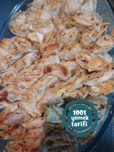 - Daha sonra dilim dilim keserek borcama diziyoruz. Üzerine sıvı yağ sürüp önceden ısıtılmış 180 °lik fırında 25-30 dk üzeri kızarıncaya kadar pişiriyoruz.