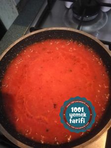 - İçine nane ekleyip salçanın iyice erimesini sağlıyoruz. Fırından çıkan Yufkalarımızın üzerine bu karışımı döküyoruz.