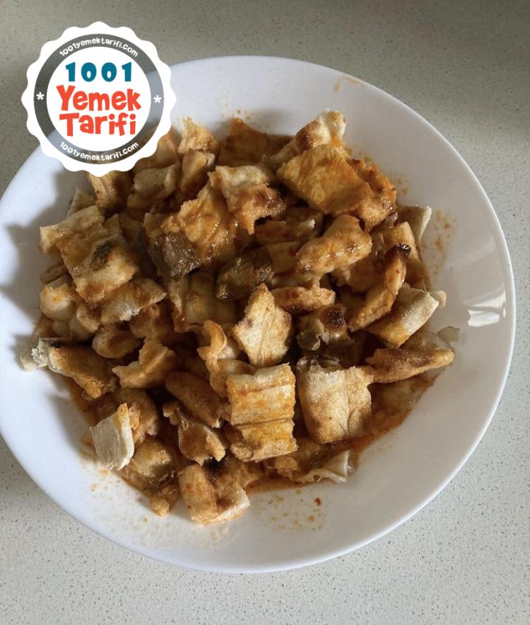 - Tabakta doğranmış pidelerin üstüne hazırlanan kavurmalı ve salçalı
