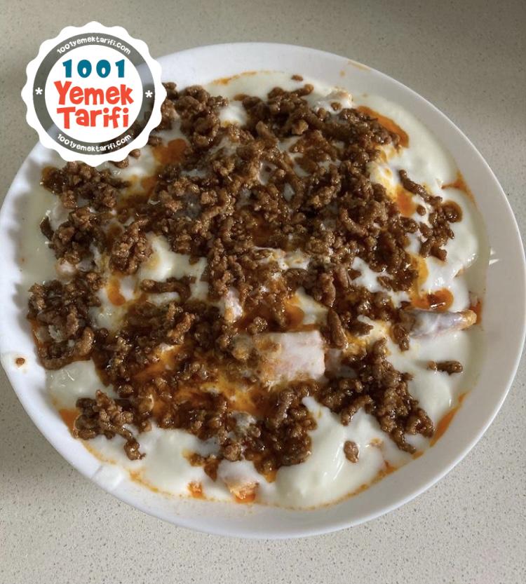 - Yoğurtun üzerine kavrulmuş kıyma serpiştirilir