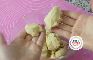 - Ele yapışmayacak bir kıvama geldiğinde krem şanti sıkma ucu yani bir duy içine hamurdan bir parça koparıp içine koyalım.