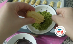 - Bir kabın içinde benmari usulü erittiğimiz çikolataya kurabiyelerimizi batıralım. Ardından Antep fıstığına bulayalım..