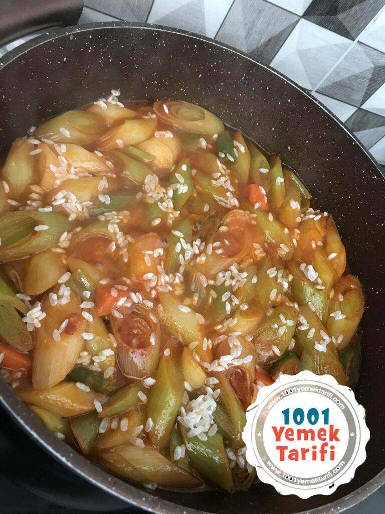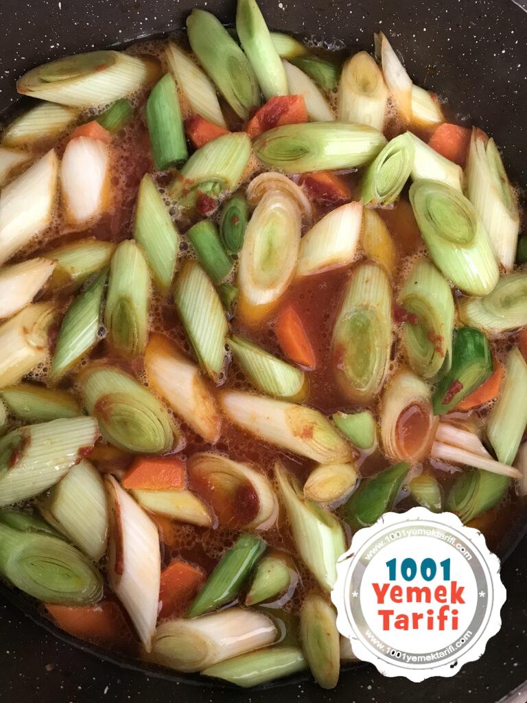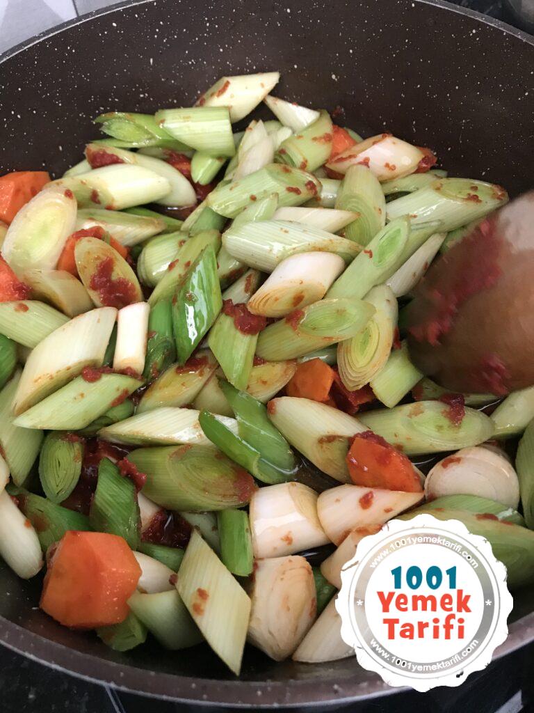 • Üzerine verev kesilmiş pırasalarımızı ve tuzu ekleyip 2-3 dk daha karıştırıyoruz.