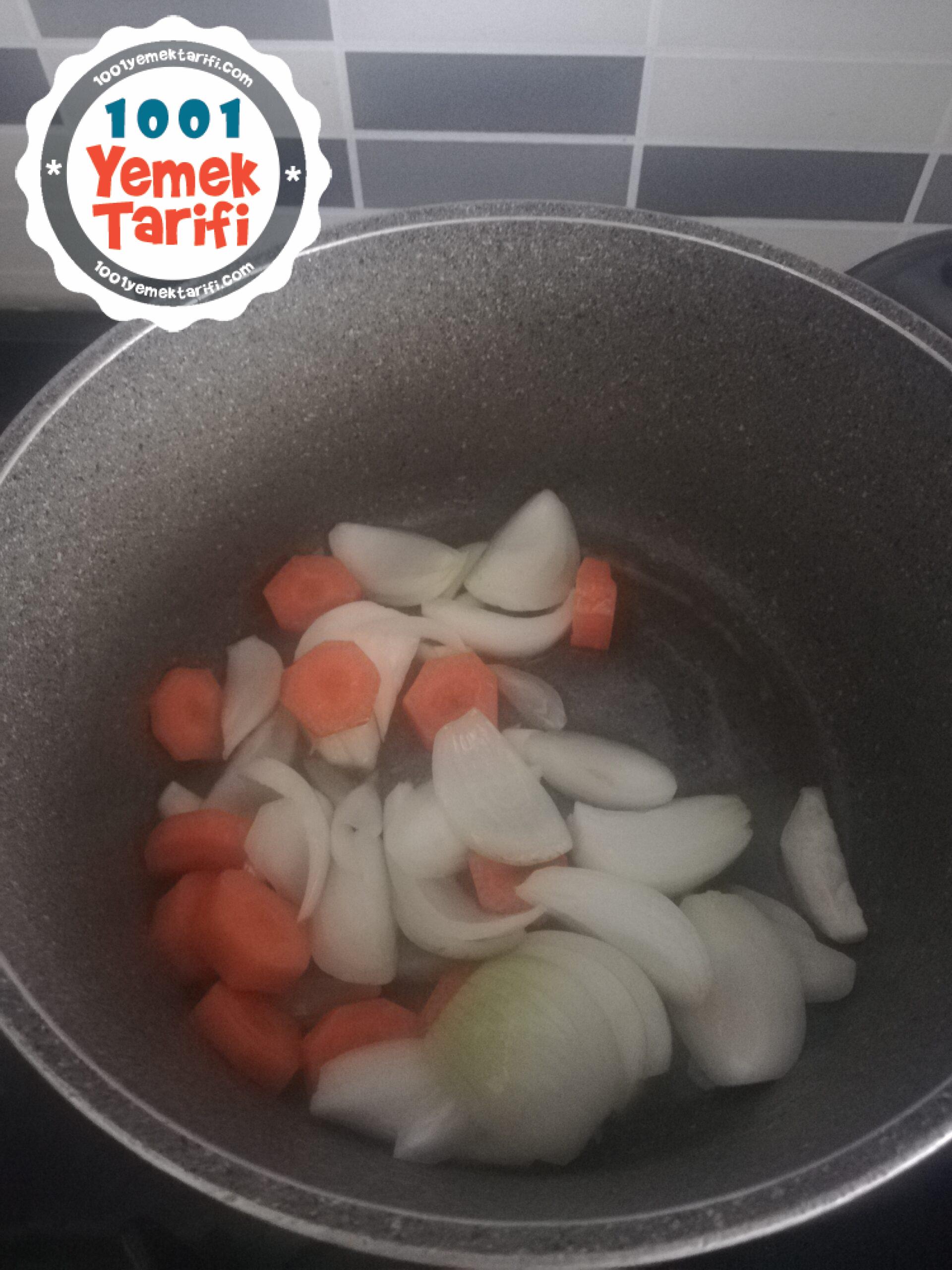 - Uygun bir tencereye sıvıyağı alıp üzerine iri doğranmış soğanı ve havucu ilave edip kavuralım