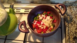 - Öncelikle soğan kapya biber ve sivri biberleri küp küp doğrayıp sıvı yağ ile derin bir tencerede kavuruyoruz.