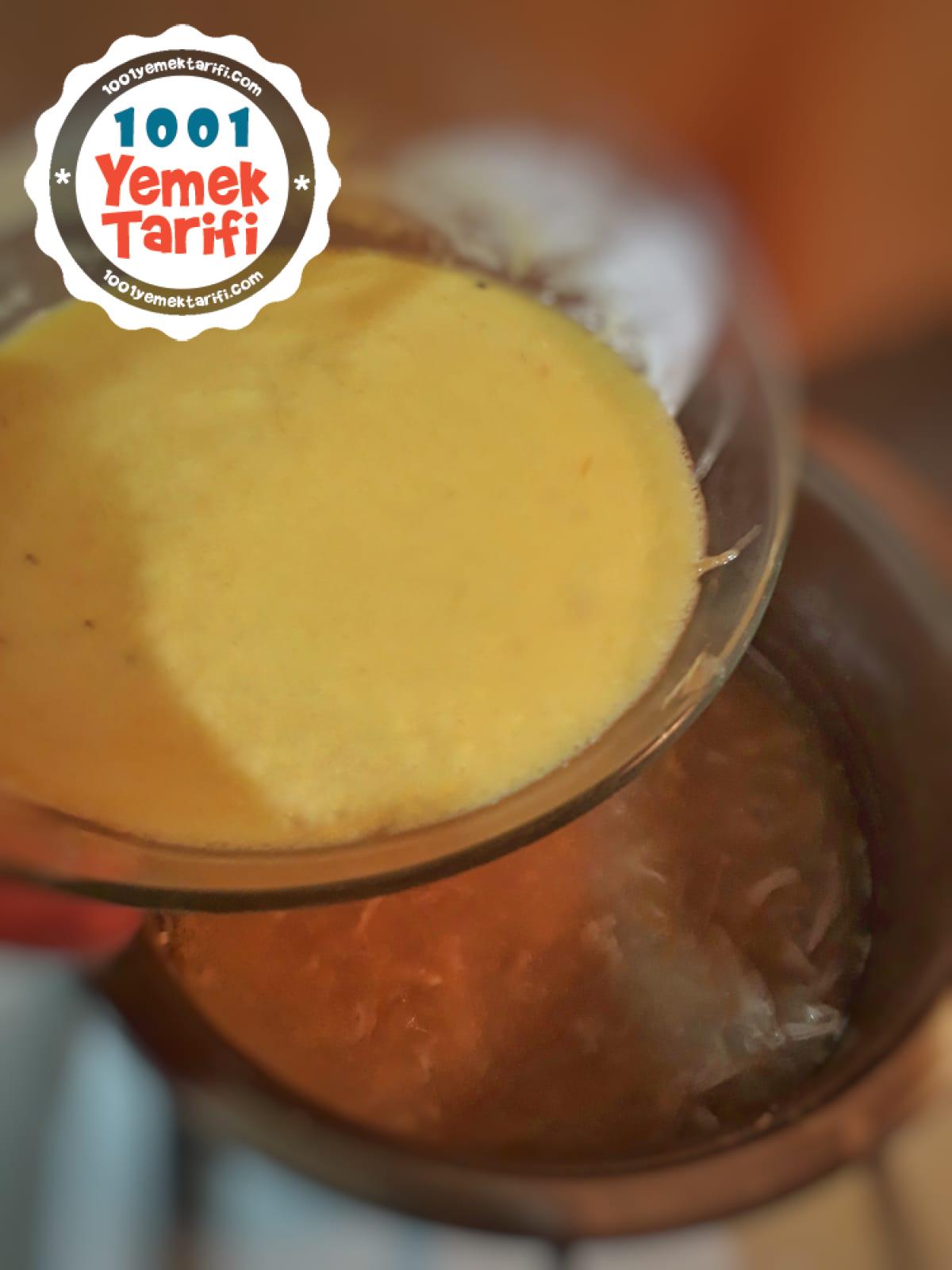 - Sonra kaynayan çorbanın suyundan içine kepçe yardımıyla yavaş yavaş ekleyin.